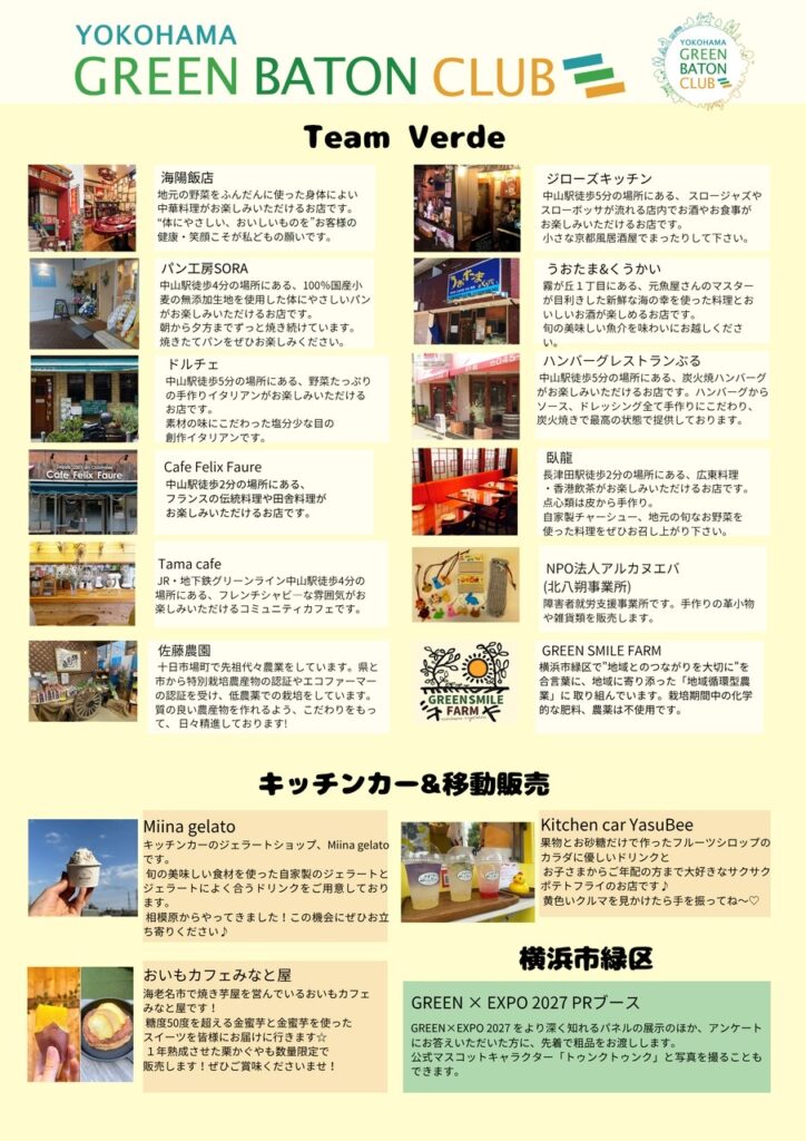 今回のマルシェは、チームヴェルデ/キッチンカー(移動販売店舗も!)/GREEN×EXPO2027宣伝ブースと盛りだくさん。
